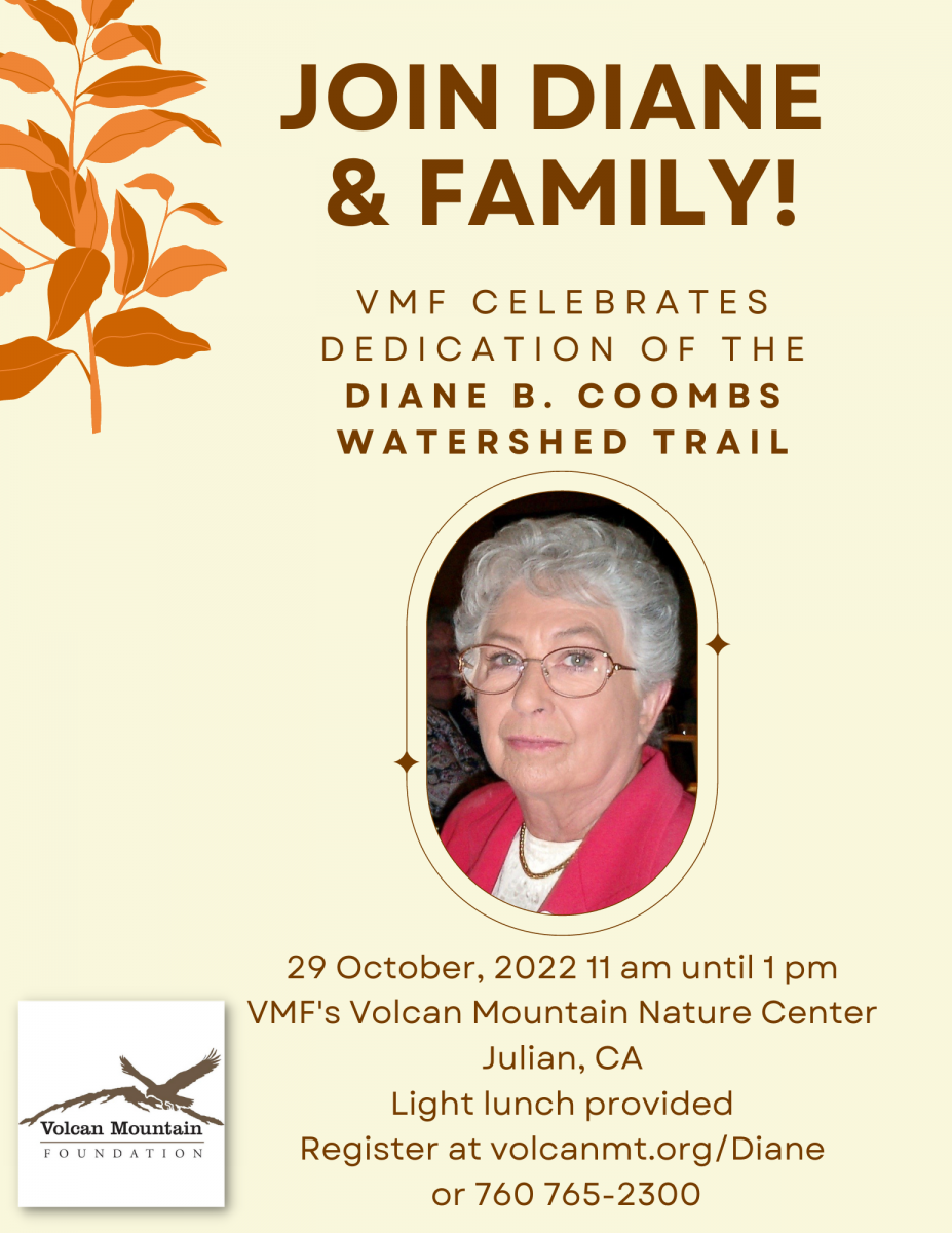 Saturday, October 29: Join Diane and her family at VMF's dedication of the Diane B. Coombs Watershed Trail at VMF's Volcan Mountain Nature Center.  We will have a light lunch catered by VMF's own volunteer committee followed by a trail dedication ceremony and plenty of time for conversation and exploration of the trail.