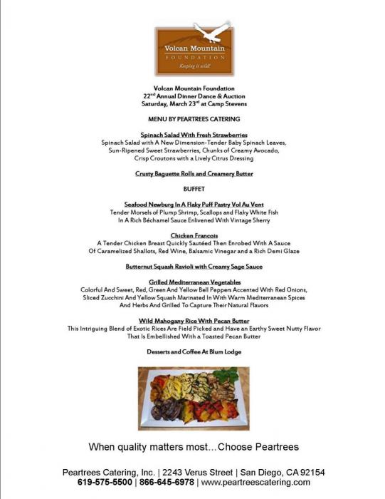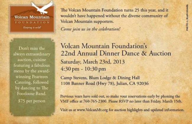 Come celebrate 25 years of keeping Volcan Mountain wild, and help support the start of the next 25 years of conservation, nature education, and preservation of the iconic backdrop to Julian. Make your reservations now for the 22nd Annual Dinner Dance and Auction fundraiser for the Volcan Mountain Foundation (VMF) which will celebrate its 25th birthday later this year.
