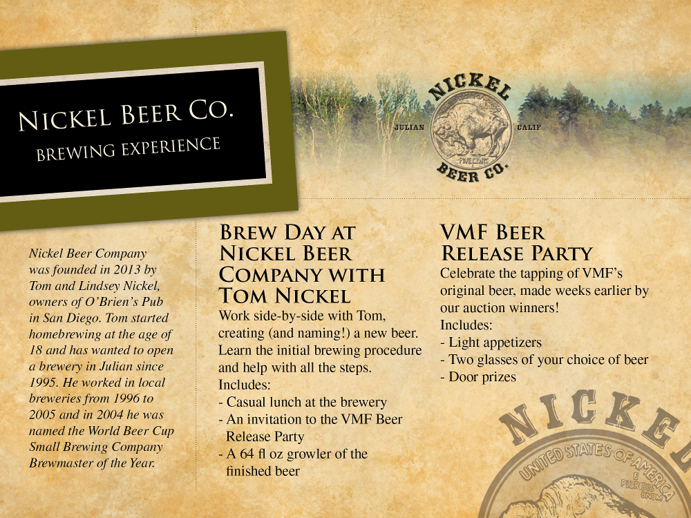 Work side-by-side with Tom creating (and naming!) a new beer. Learn the initial brewing procedure and help with all the steps. Includes: Casual lunch at the brewery, an invitation to the VMF -- Nickel Beer Company VIP Beer Release Party, and 64 fl. oz. growler of the finished beer.